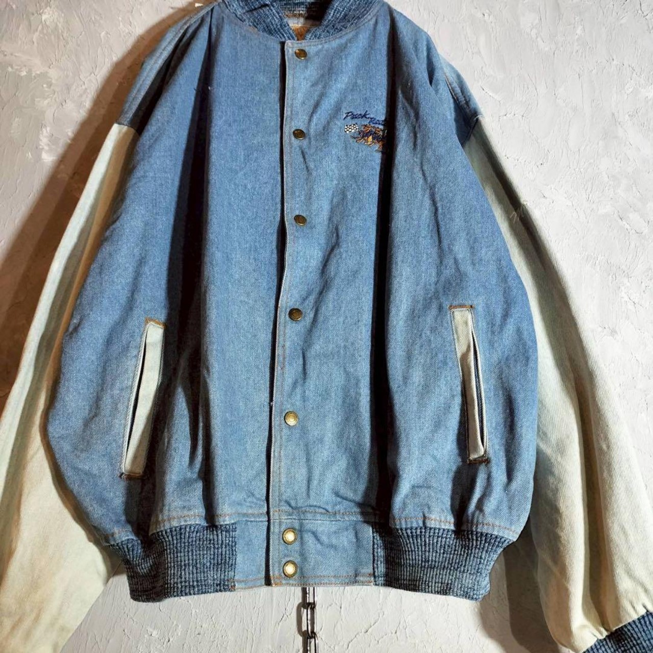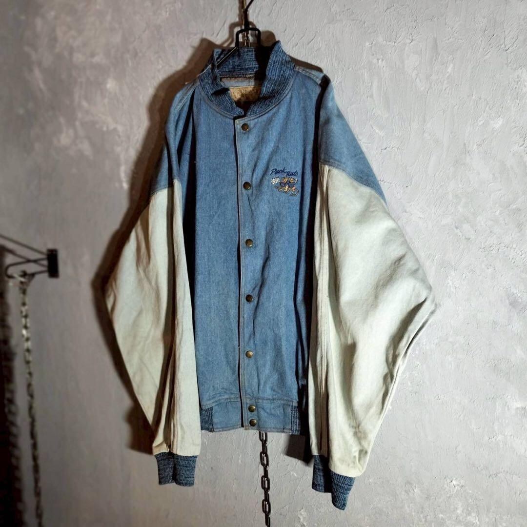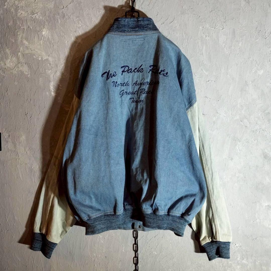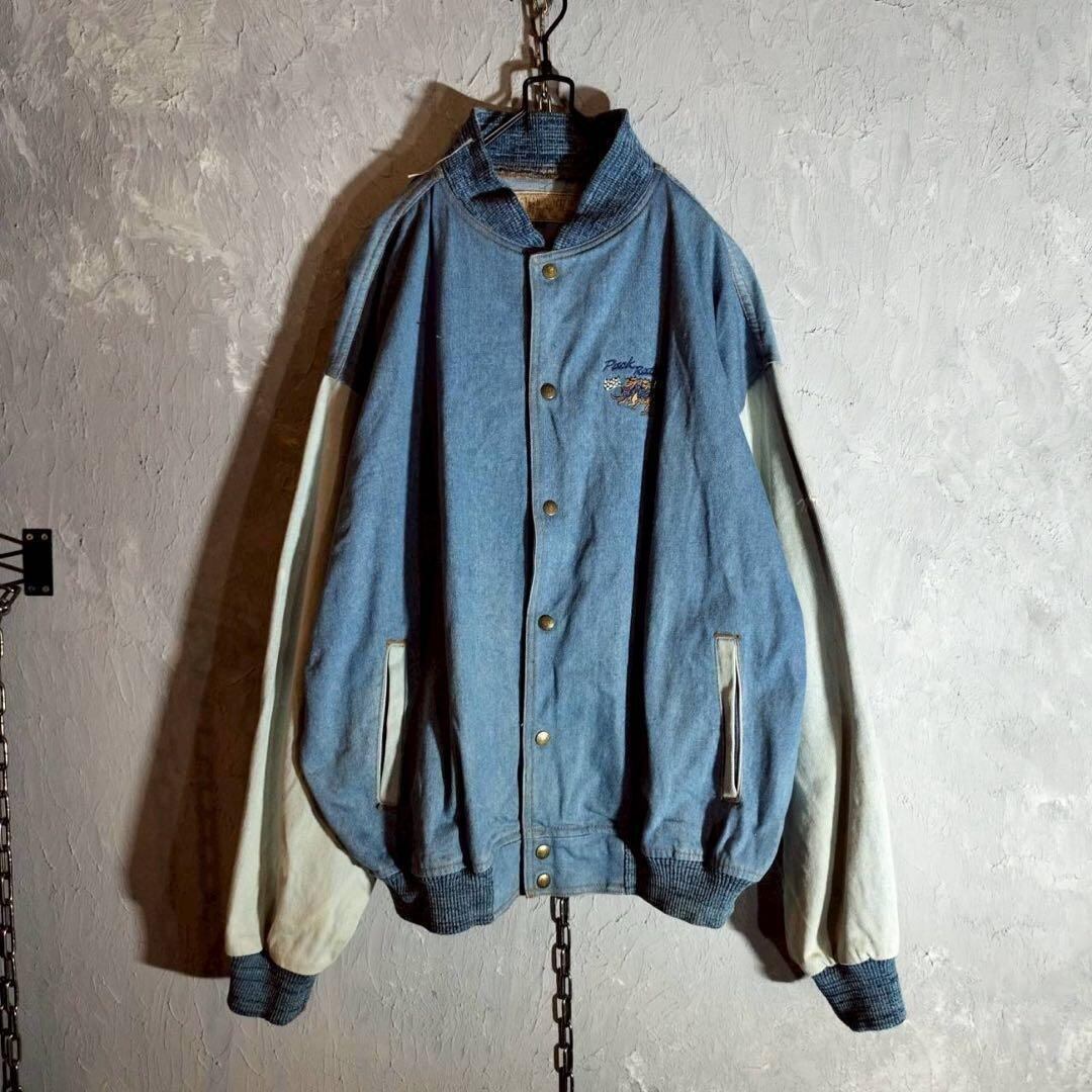 バック刺繍 デニムジャケット ベースボールジャケット ブルゾン XL アメカジ ユニセックス 古着