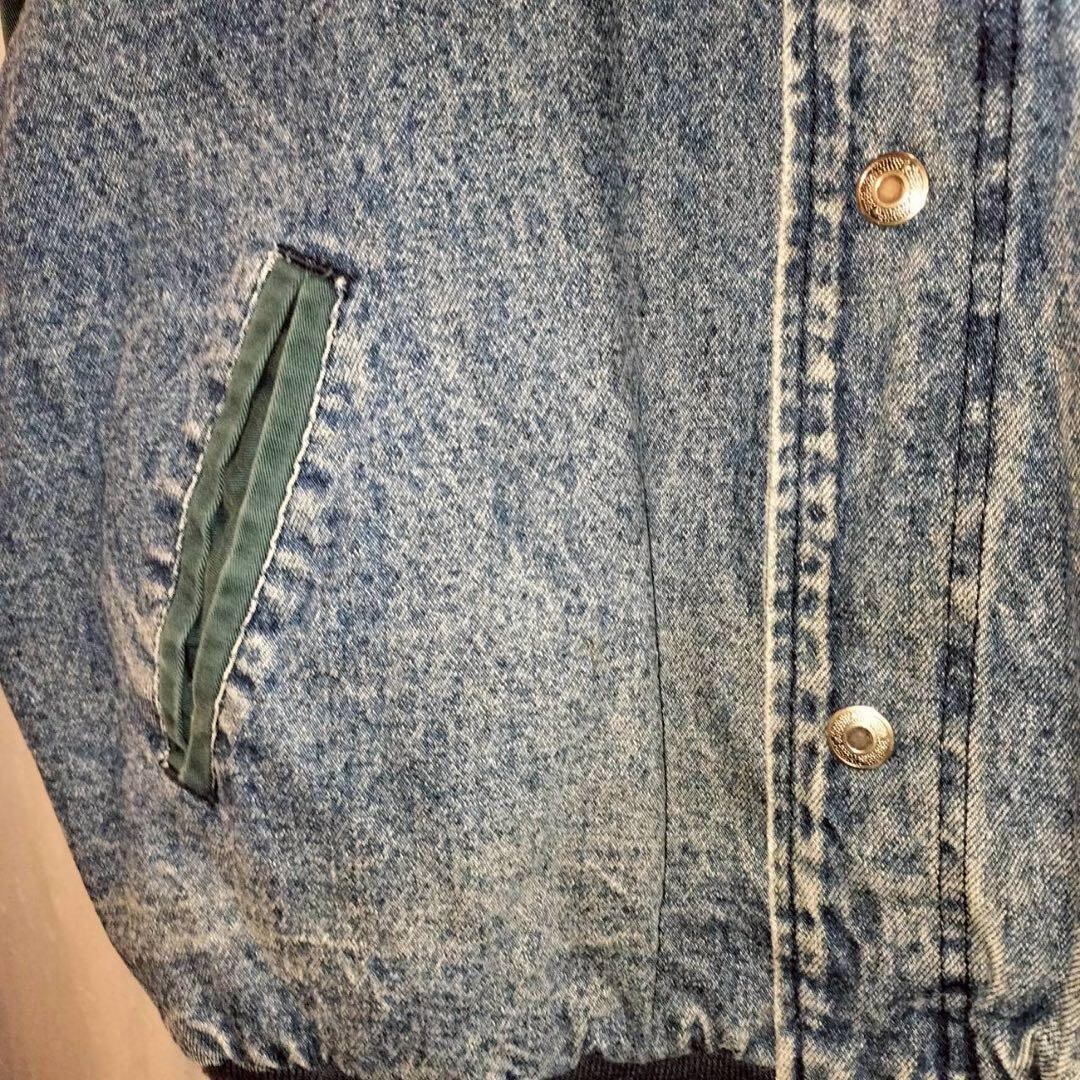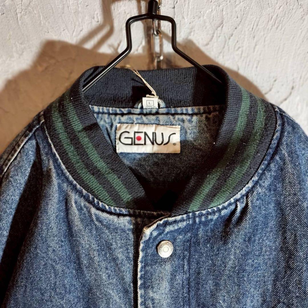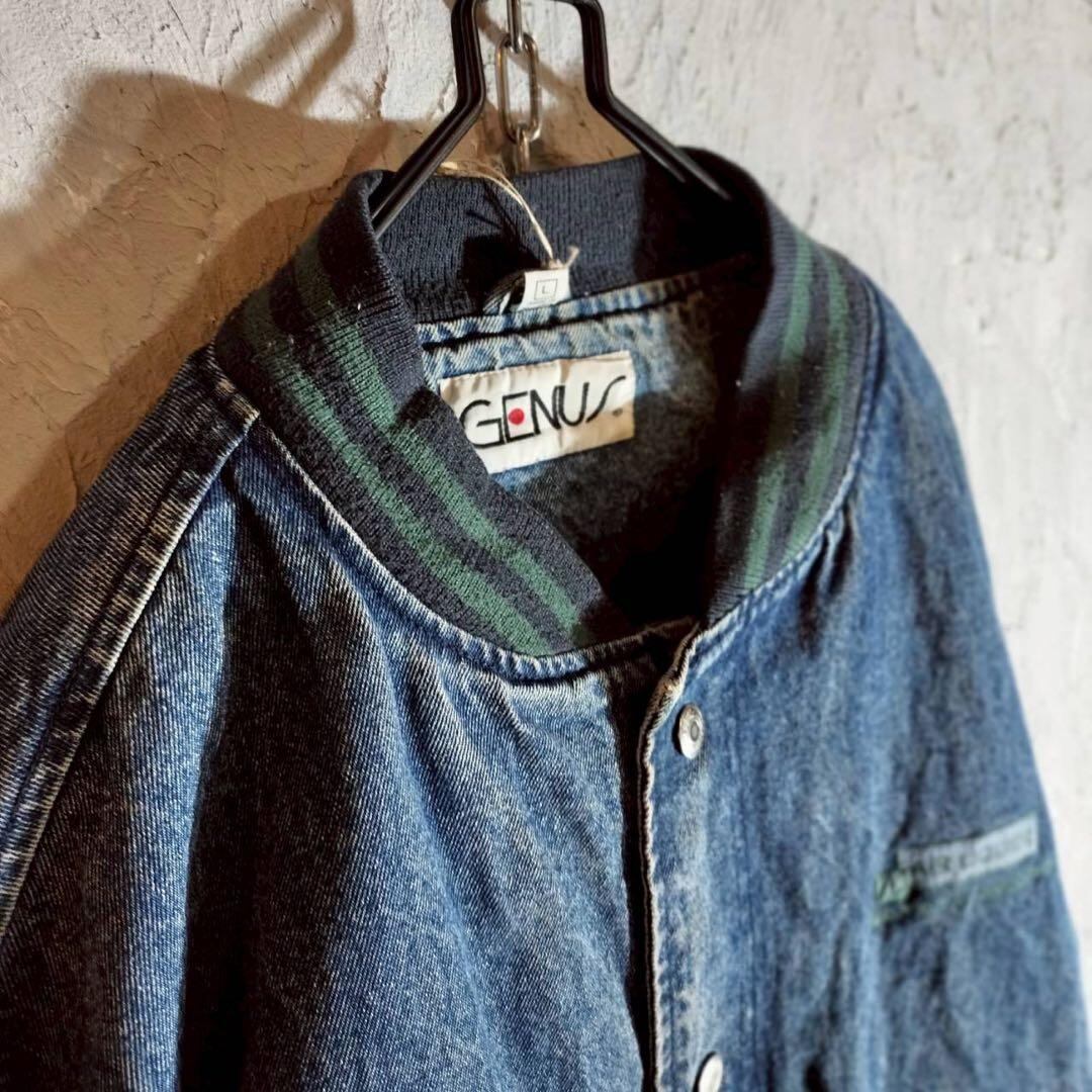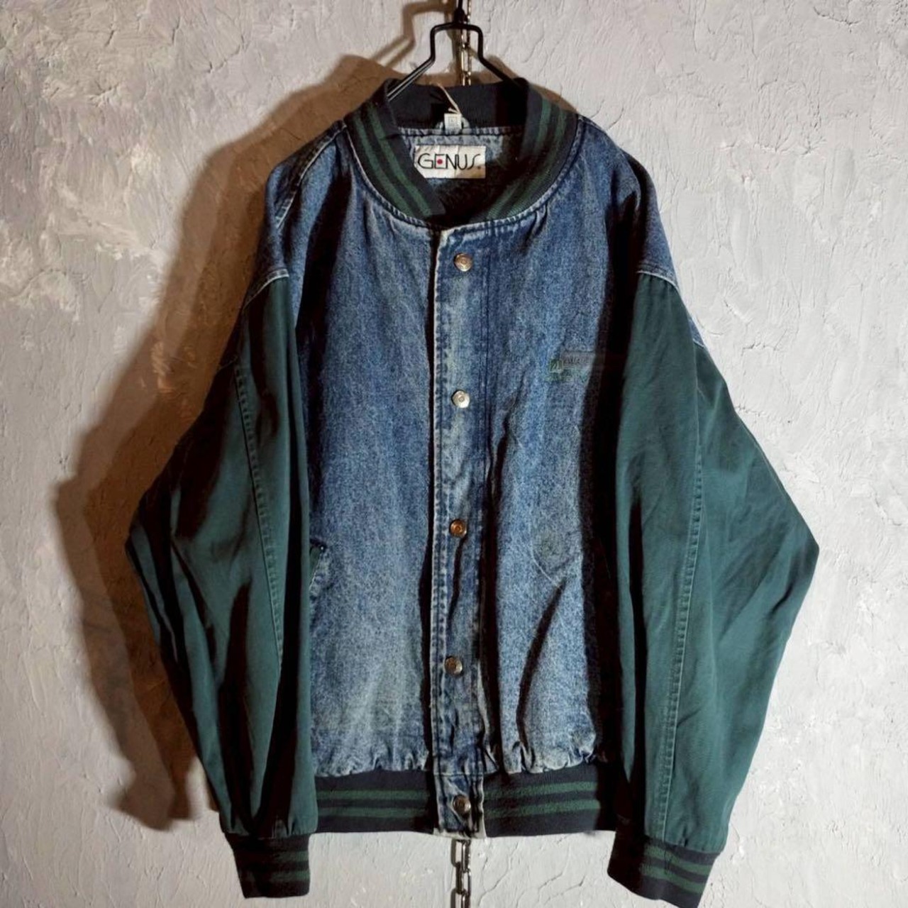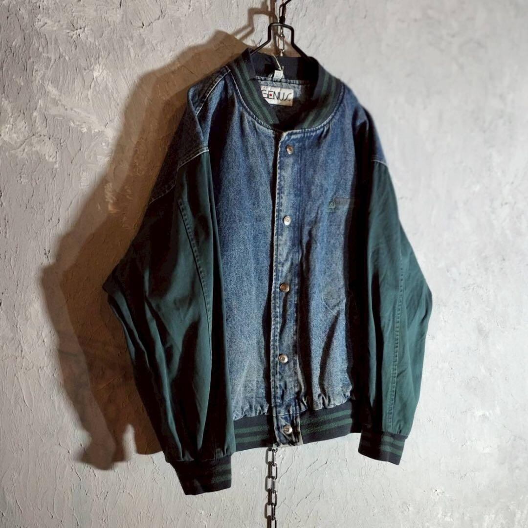 グリーン切替 ベースボールジャケット デニムジャケット ブルゾン USA L 企業ロゴ アメカジ ユニセックス 古着