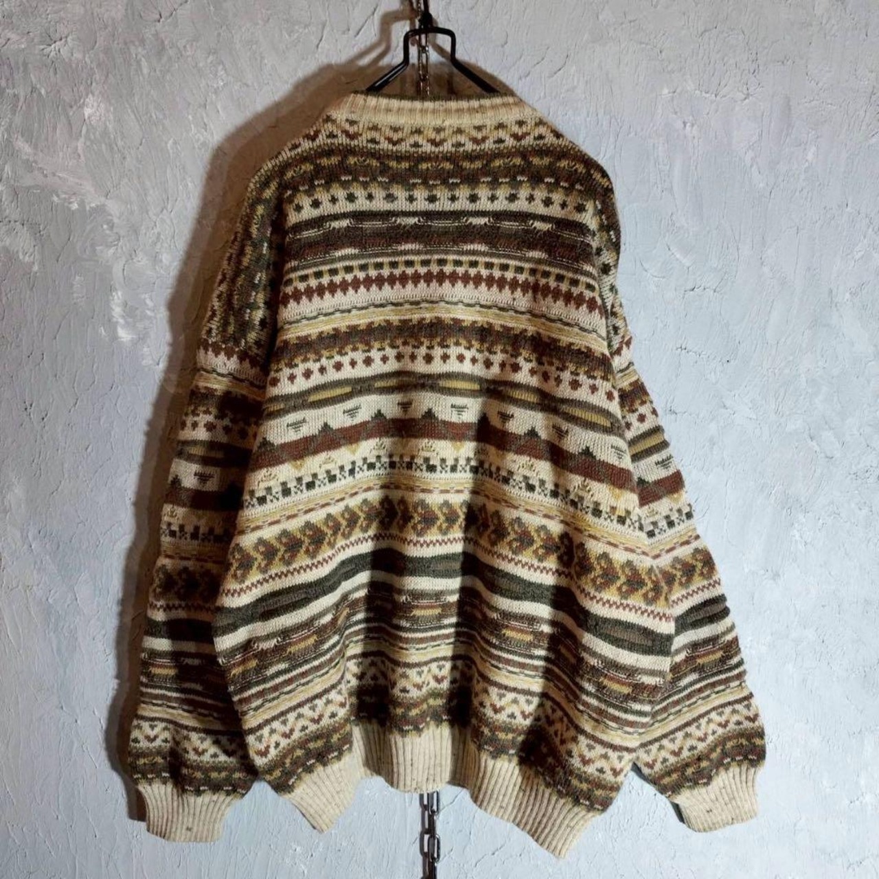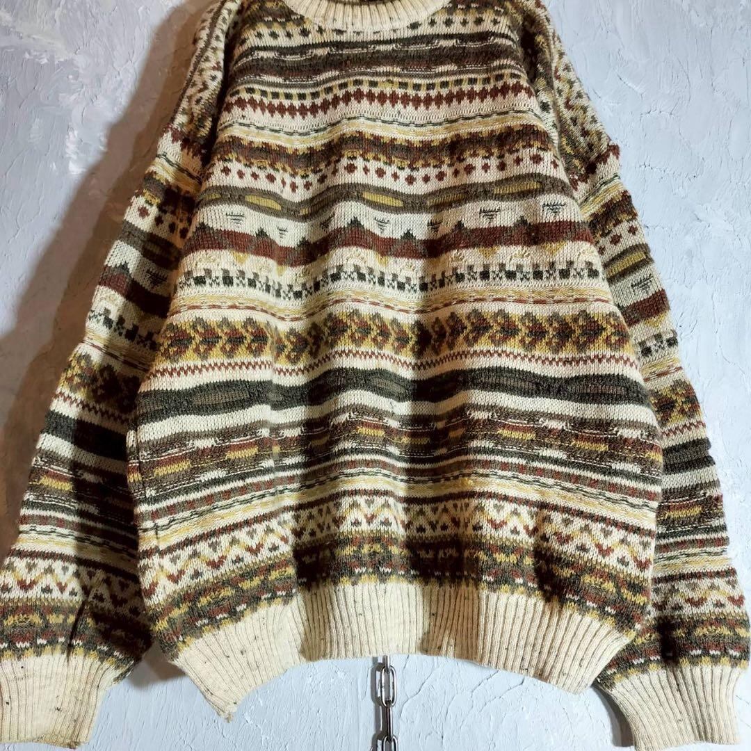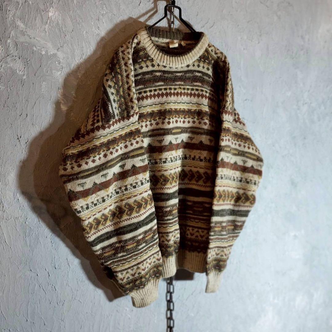 80s イタリア製 3Dニット セーター ウール混 総柄 LL ヴィンテージ ユーロ古着