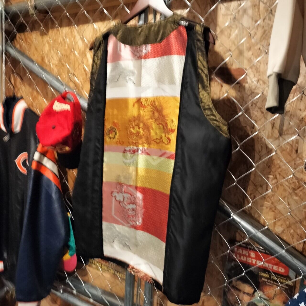 ■ ヴンテージ 着物リメイク ベスト 着物ベスト 古帯リメイク シーサー柄 和柄 リバーシブル 一点物 古着 【V89】