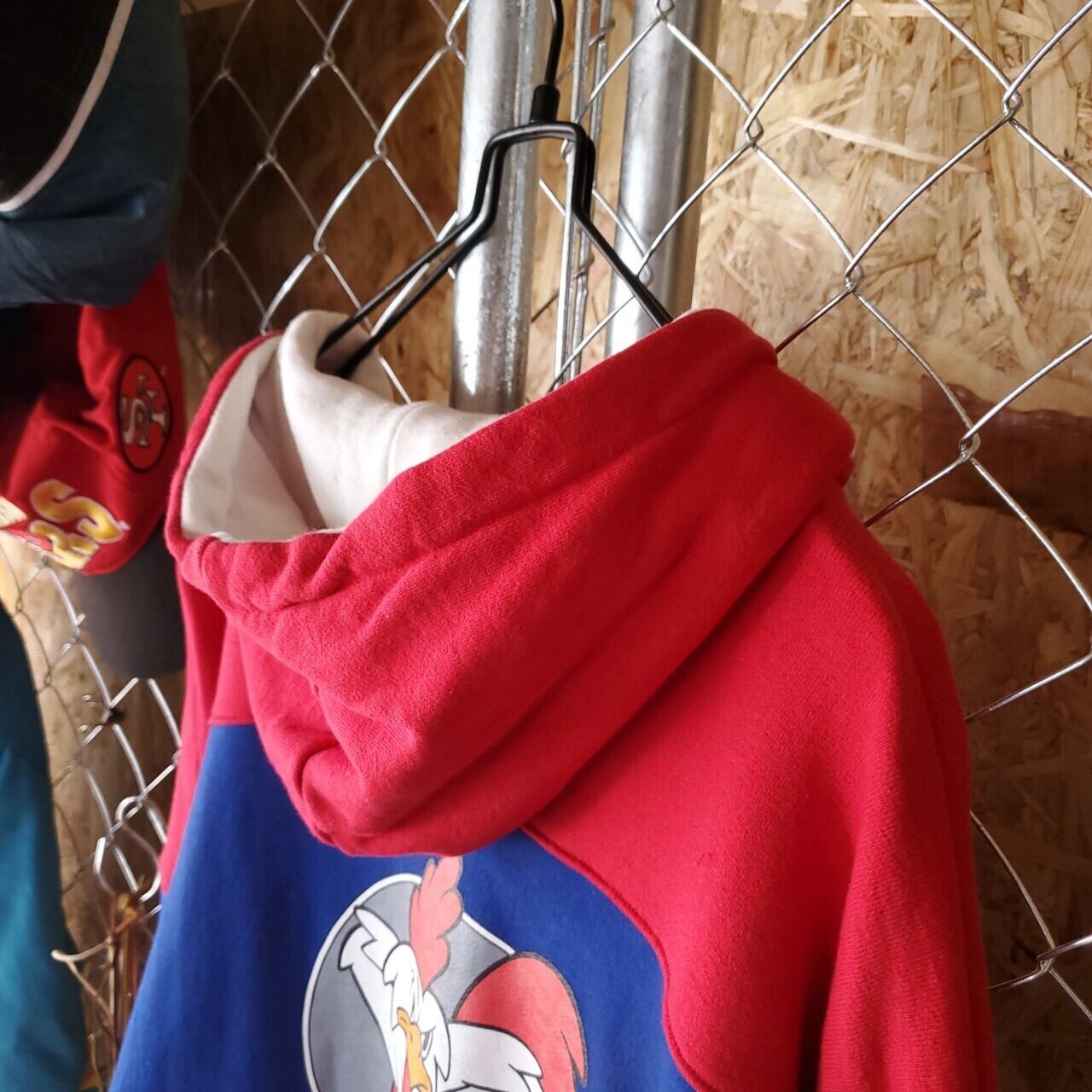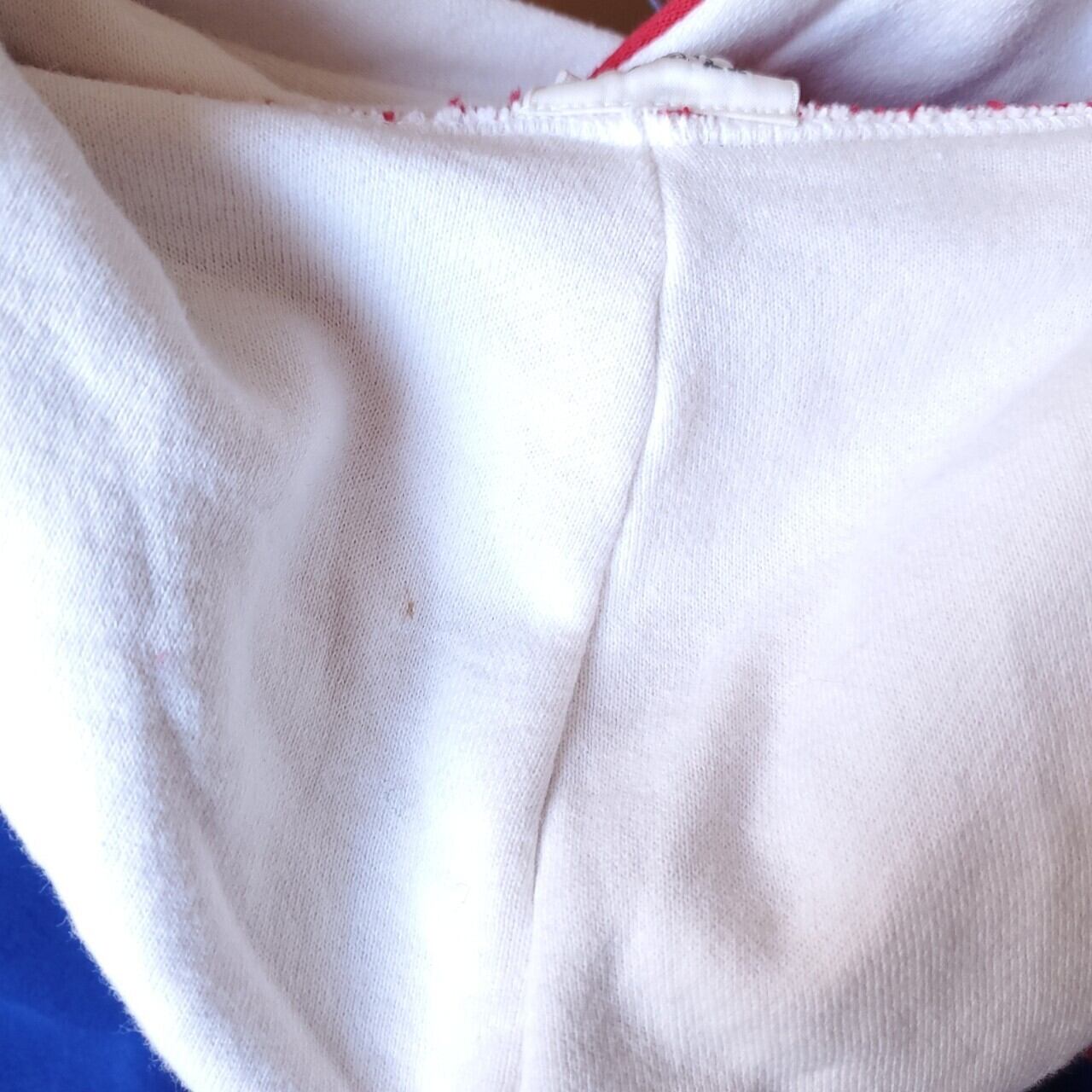 バック〜脇腕付近に一部色移りのような変色・フード裏に汚れが見られます。